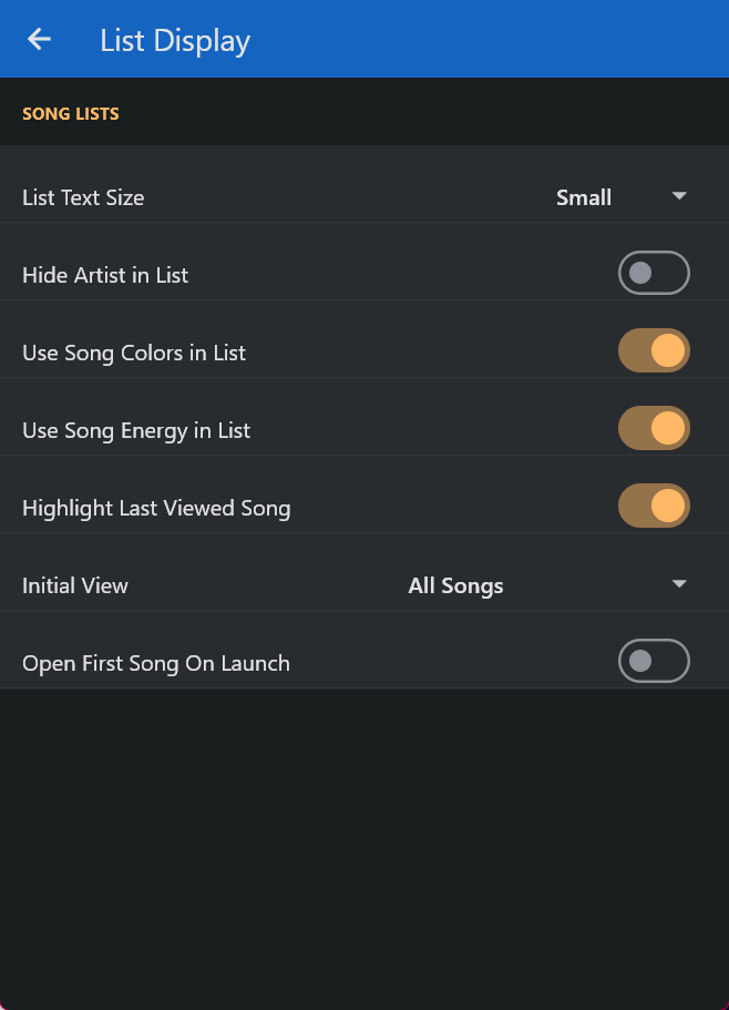 The List Display Settings page lives in LivePrompter’s settings in the “Display” section. It allows you to configure how LivePrompter displays song lists in the Home and Search Screens: