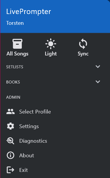 Note: as of release 1.5.7, the drawer has been re-designed a bit: first, the “All Songs”, “Light/Dark Mode” and “Sync” items have been grouped at the top of the drawer for easier access. Second: the “Setlists” and “Books” sections are now collapsible/expandable (arrow button at the right of the title) so the menu doesn’t become too long and not so much scrolling is necessary.